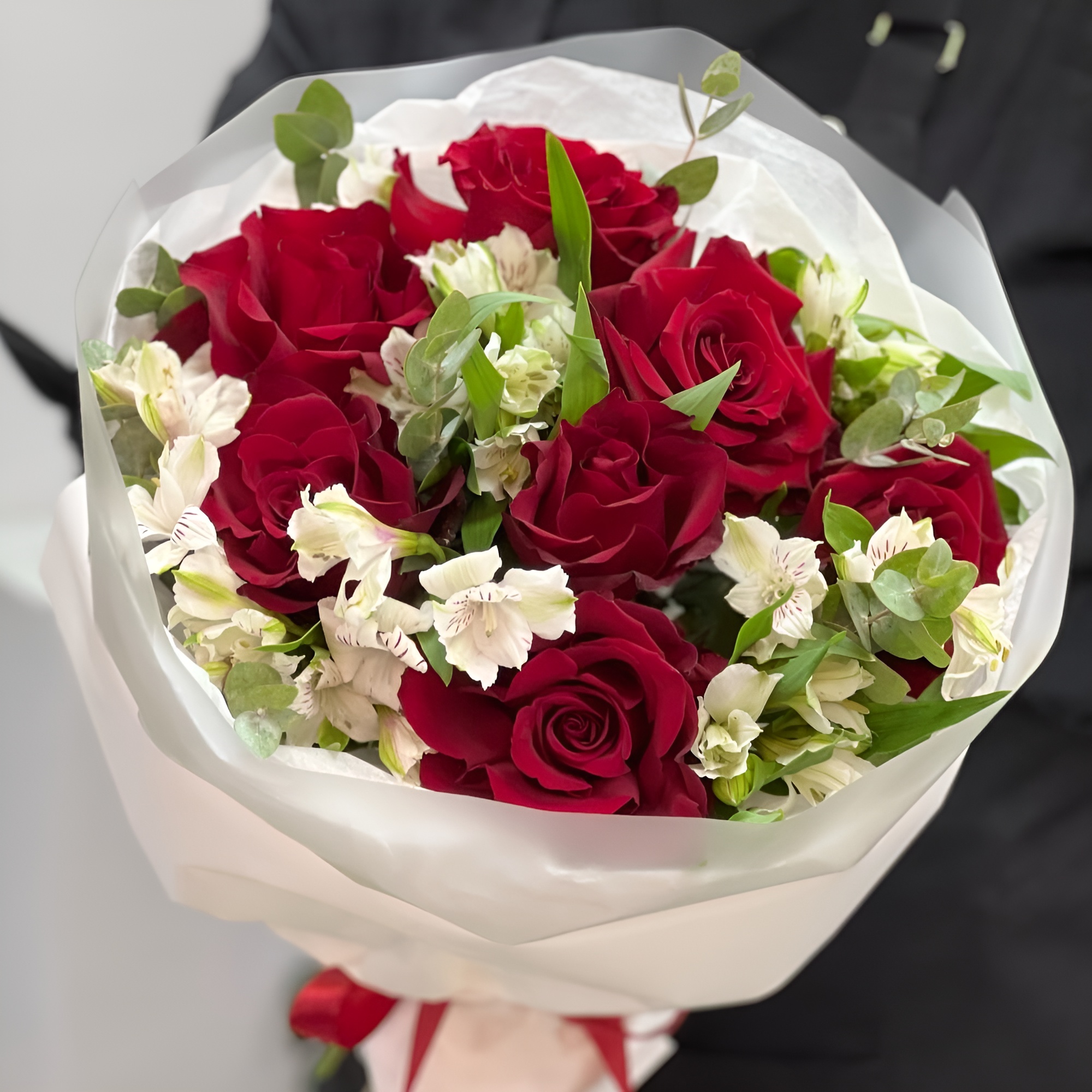 Роскошный букет «Любимой» из 7 эквадорских роз и белых альстромерий.