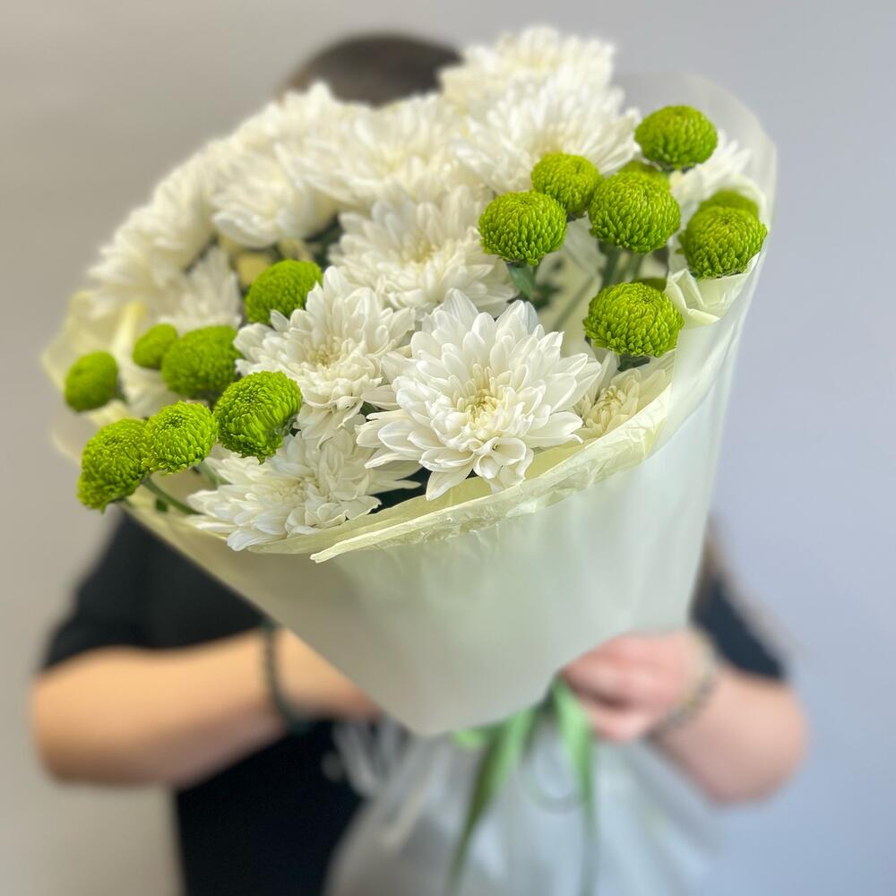 Уникальная композиция из белоснежных кустовых хризантем и редких зеленых «Филин Грин» — воплощение свежести и элегантности. Идеальный выбор для ценителей необычных цветочных решений. Букет цветов с доставкой Усолье-Сибирское.